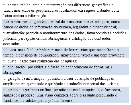 Portanto, a internet possibilitou novas formas de obtenção da informação jurídica e pelo acesso em tempo real, imediato, garantindo maior agilidade na obtenção dos resultados da pesquisa, independente de sua localização geográfica.