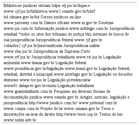 As fontes de informação jurídicas exercem um papel importante no desempenho das atividades competentes do profissional de Direito. Para fins documentais, os sistemas de informação, bases de dados, sites e portais eletrônicos contribuem como ferramentas indispensáveis para auxiliar na busca e recuperação dos assuntos jurídicos pesquisados. (BARROS, 2004).