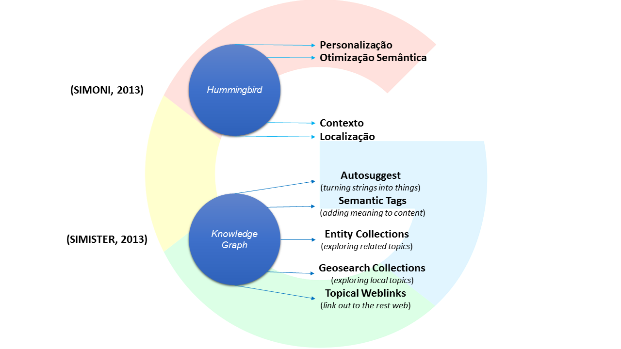 Assim, de acordo com Simoni (2013), o Google, e, portanto o KG, realiza sua indexação e busca a partir dos atributos de personalização, otimização semântica, contexto e localização. A partir da Figura 4 é possível verificar os atributos tanto do KG quanto do hummingbirds.