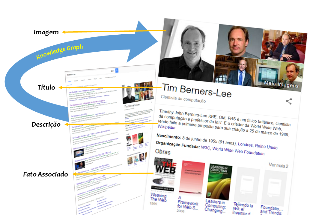 Nessa direção, em 2013 no Brasil e 2012 em língua inglesa, foi possível perceber traços semânticos dos resultados de busca nos mecanismos, com o aparecimento do “Knowledge Graph[2]” do Google (KG ou Mapa do Conhecimento e hoje por outros mecanismos de busca, como o Bing), e foi descrito como um enorme mapa de elementos do mundo real e as conexões entre eles, de modo a oferecer resultados mais relevantes (GOOGLE, 2012).