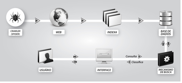 Dessa maneira, um motor de busca faz parte de um sistema maior, que utiliza aplicativos (crawler, spider ou robô) para capturar palavras-chave e frases que identifiquem o conteúdo de uma página Web para indexá-la e armazená-la em sua base de dados. Do outro lado, conta com uma interface destinada ao usuário para consultar essas informações mediante a inserção de termos de pesquisa que irão acionar o algoritmo de busca para exibir os resultados recuperados da base de dados (LEDFORD, 2009). As ferramentas para recuperação de informações da rede ou em plataformas específicas da Web são entendidas nesta pesquisa como