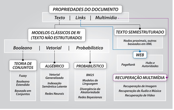 Já para Baeza-Yates e Ribeiro Neto (2013), os modelos de SRI podem ser divididos em três diferentes categorias: baseados em texto, baseados em links e baseados em objetos multimídia, conforme a Figura 1.