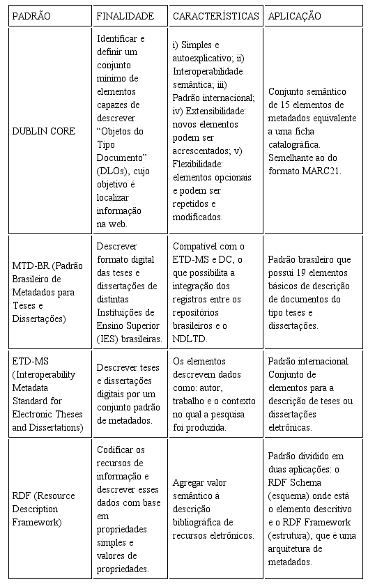 Em uma biblioteca digital, basicamente se utilizam os metadados: i) descritivos (ex.: autor, título), ii) estruturais (ex.: tags de marcação) e iii) administrativos (ex.: senhas, data de digitalização). No domínio da catalogação, os metadados se referem às formas de representação da descrição de dados bibliográficos e catalográficos, com o objetivo de tornar único, localizável e acessível o objeto catalogado. Todavia, para atingir todo o potencial do uso de sistemas de metadados, é necessária a criação e a integração de conjuntos de elementos de metadados, para que possam padronizar a descrição de recursos com finalidades específicas. Tais questões são tema de discussão na área e algumas propostas aparecem, dentre as quais se destacam conforme demonstrado no quadro 1: