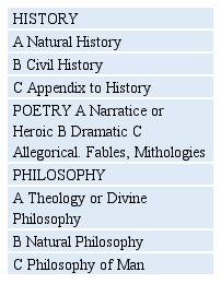 Toda classificação, por mais universalista que se pretenda, não consegue escapar dos limites de sua época. No caso de Bacon, não somente os incipientes desdobramentos científicos flagravam a forma de pensar do século XVII, mas também os desdobramentos artísticos. Conforme colocou Harris (1870), o desenvolvimento ainda precário da ficção em prosa levava obras clássicas da literatura, tais como os romances de Lúcio Apuleio e as novelas de Giovanni Boccaccio, a serem alocadas na segunda divisão da classificação de Bacon, todas submetidas à denominação de Poesia.