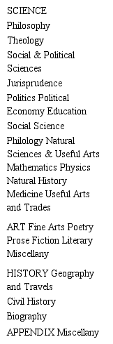 “Philosophy” is the highest type of Science, and hence begins the catalogue. Science ends with the useful Arts, which form a transition to division of Esthetic/Art, and this should commence with de Fine Arts, and be followed by Poetry. Geograph, as being of the most external character, precedes History (HARRIS, 1870, p. 120).