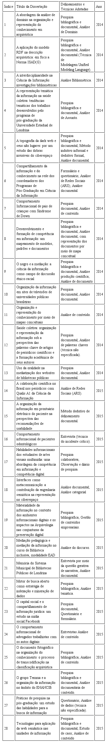 Por meio do quadro 1, é possível observar que, em 2014, ano em que o PPGCI/UEL teve sua primeira turma de defesas de dissertações no Programa de Mestrado Acadêmico, o número de dissertações apresentadas foram 13 e no ano seguinte 15, totalizando 28 dissertações.