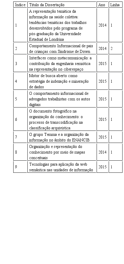 Segundo Souza e Stumpf (2009, p.52), “as linhas de pesquisa aglutinam as investigações que tem afinidades entre si, e a elas se filiam os projetos de pesquisa dos docentes e, consequentemente, as dissertações que orientam”. O volume de dissertações concluídas segundo as linhas de pesquisa também pode ser visualizado no quadro 3, mas o que chama a atenção é que ela foi usada quase na totalidade na linha de pesquisa 1, referente à organização e representação da informação e do conhecimento.