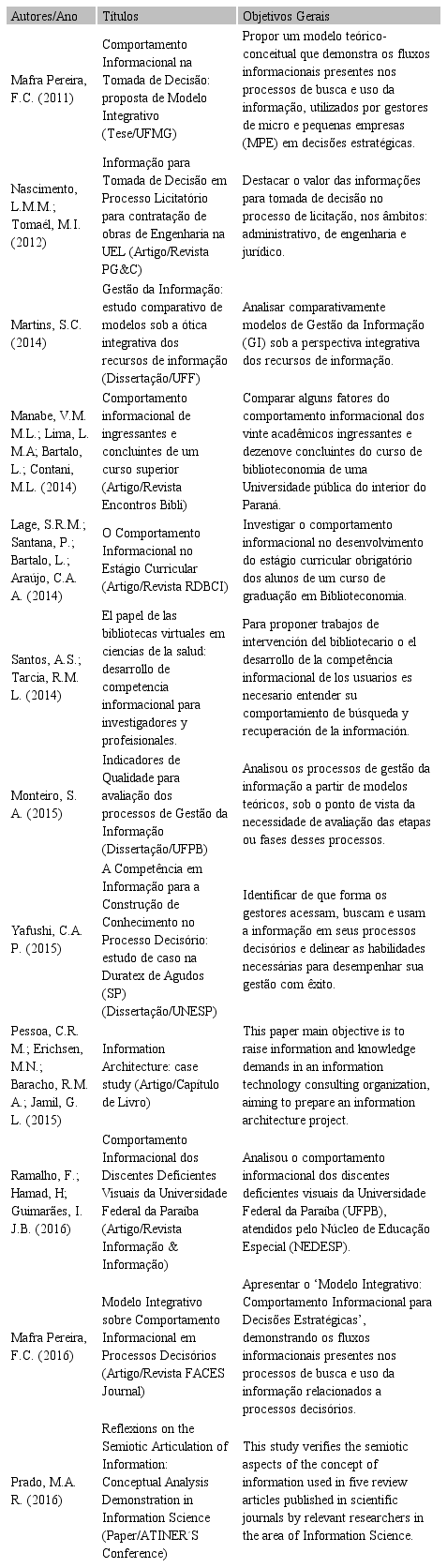 O modelo desenvolvido por Mafra Pereira (2010), e que foi o marco teórico deste trabalho, já foi referenciado em outros estudos nos campos da Ciência da Informação e Gestão da Informação, tanto em nível nacional, quanto internacional, como pode ser constatado na Tabela 1, o que garante ainda mais a escolha e a (re) validação do referido modelo para o objetivo a que se propôs esse trabalho.