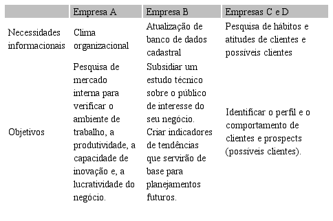 Já a Empresa B solicitou uma pesquisa de mercado com o objetivo de obter informações para atualizar um banco de dados cadastral sócio econômico e subsidiar um estudo técnico sobre o público de interesse do seu negócio. Os resultados obtidos tinham como finalidade a criação de indicadores de tendências que serviriam de base para planejamentos dos negócios.