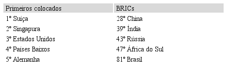 As definições e classificações apresentadas ilustram a abrangência e complexidade do tema, além de fortalecer e evidenciar a dificuldade de incorporação dos mesmos, pelos empresários. Ao confrontar a teoria com a prática, considerando a realidade brasileira, para o Global Competitiveness Report (2016) ou Relatório Global de Competitividade, organizado pelo Fórum Econômico Mundial, o Brasil ocupava a 48ª posição em 2012, caiu para a 76ª colocação em 2015, chegando, em 2016, a ocupar o 81º lugar (Tabela 1). Ou seja, no intervalo de quatro anos (2012-2016) o país perdeu 33 posições, ficando atrás, por exemplo, dos demais países que, ao lado do Brasil, formam os BRICS (Rússia, Índia, China e África do Sul).