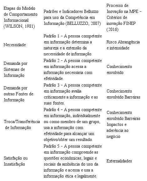 Percebe-se que ao analisar o comportamento informacional, a competência em informação e o processo de inovação, partindo das perspectivas de Wilson, Belluzzo e dos critérios de inovação proposto pelo FINEP, que os três elementos estão inter-relacionados no que tange cada etapa (ver Quadro 1).