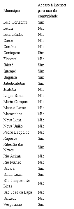 A aplicação do questionário, primeira etapa da pesquisa, foi realizada com os 34 municípios que compõem a Região Metropolitana de Belo Horizonte. Foram recebidas 29 respostas, totalizando 85% de retorno. Perguntados sobre a presença de computadores com acesso à internet para uso da população atendida, 11 instituições afirmaram disponibilizar o serviço, conforme Quadro 1.