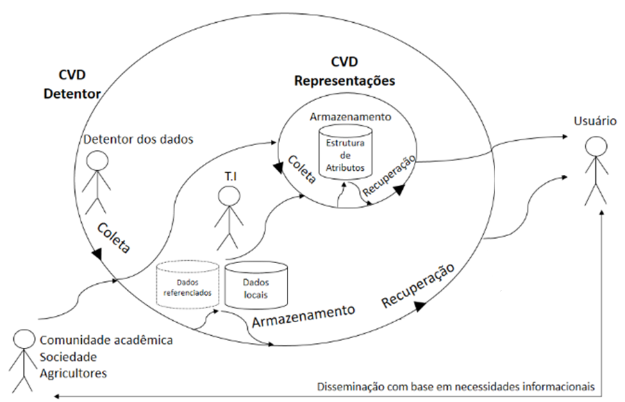 Abstract: The use of the Internet makes the data and information sharing happens in dialogical way, and agriculture is one of sectors that can obtain benefit from the use of this technology. The CoDAF Portal is a website that offer specialized contents in an agricultural domain such as publishing representations of agricultural data sources, to increase the data access for small farmers and other actors engaged in the theme. The aims of this research are to describe the process of collaborative construction of representations of Data sources on this website, pointing the mains actors and activities involved, and to identify elements of its framework, highlighting the informational needs that can be solved by the use of the referred data. The methodology was based on the Data Life Cycle as a model to systematize the informational flow studied. The result was a description of a set of attributes to define the framework of the representations, and the identification of the informational needs which can solved with the use of referenced data sources.