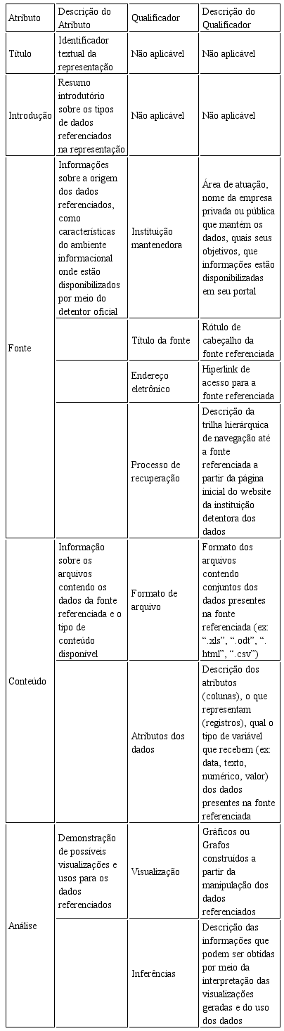 O Quadro 1 sistematiza os principais elementos estruturais das representações de dados publicadas no Portal CoDAF, e assinala os atributos e seus respectivos qualificadores, quando aplicável.