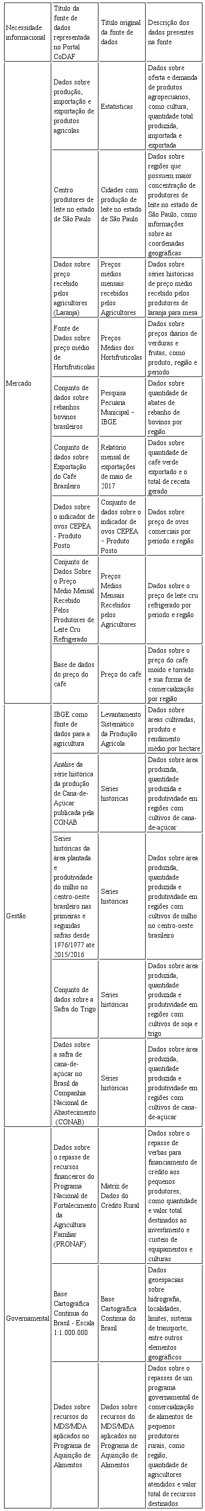 Concomitante à sistematização dos atores e atividades envolvidos na construção colaborativa das representações, e da análise de sua estrutura e elementos, buscou-se verificar a aderência dos dados presentes nas fontes referenciadas pelas representações de dados publicadas no Portal CoDAF com necessidades informacionais de pequenos produtores rurais.