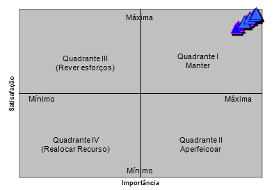 Nessa bienal do livro (Zona da Mata), sobreveio uma concentração no quadrante 1 (manter) de todos os vinte e dois atributos da qualidade, e isso sugere que a clientela da bienal vê todos esses atributos como sendo altamente importantes e bem desempenhados pela feira, como pode ser vislumbrado na Figura 1.