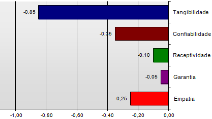 Para o cálculo dos gaps por dimensão foram somadas as médias dos itens de cada determinante e divididas pelo total de questões de cada dimensão contida no questionário aplicado. Por exemplo, para o cálculo dos gaps da determinante Receptividade, foram somadas as médias das pontuações das questões relativas a esta dimensão, e depois divididas por quatro, que era o número de itens relacionados a esta dimensão. A figura 2 apresenta os gaps por dimensão da qualidade em serviços: