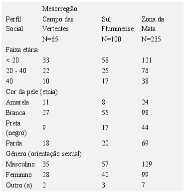 Com a tabela cima (Tabela 1) obtemos uma breve identificação da comunidade abordada - e assim, verifica-se que a maioria dos respondentes 212 (53%) são jovens com menos de 20 anos; a etnia predominante autodeclarada é branca 180 (45,00%) e sobressai a participação de respondentes do gênero masculino 221 (55,25%).