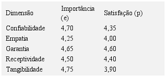 A tabela 2 apresenta a média da pontuação (em uma escala de 1 a 5) recebida pelos indicadores da qualidade de serviço a respeito da importância e satisfação, agrupados por dimensão: