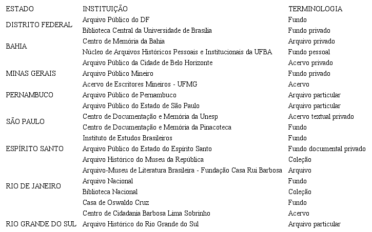 Tendo em vista o contexto brasileiro e as informações coletadas a partir da pesquisa documental nas vinte instituições públicas – localizadas em sete estados brasileiros e o Distrito Federal – custodiadoras de arquivos pessoais de escritores, observa-se no quadro a seguir os dados obtidos durante a investigação: