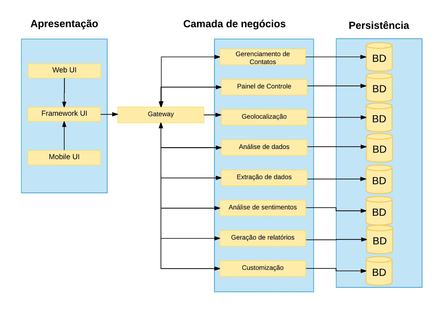 Utilizando as funcionalidades sobreditas é possível propor um diagrama de camadas de um sistema de CRM Social que utiliza uma arquitetura de microsserviços, conforme consta na Figura 2.