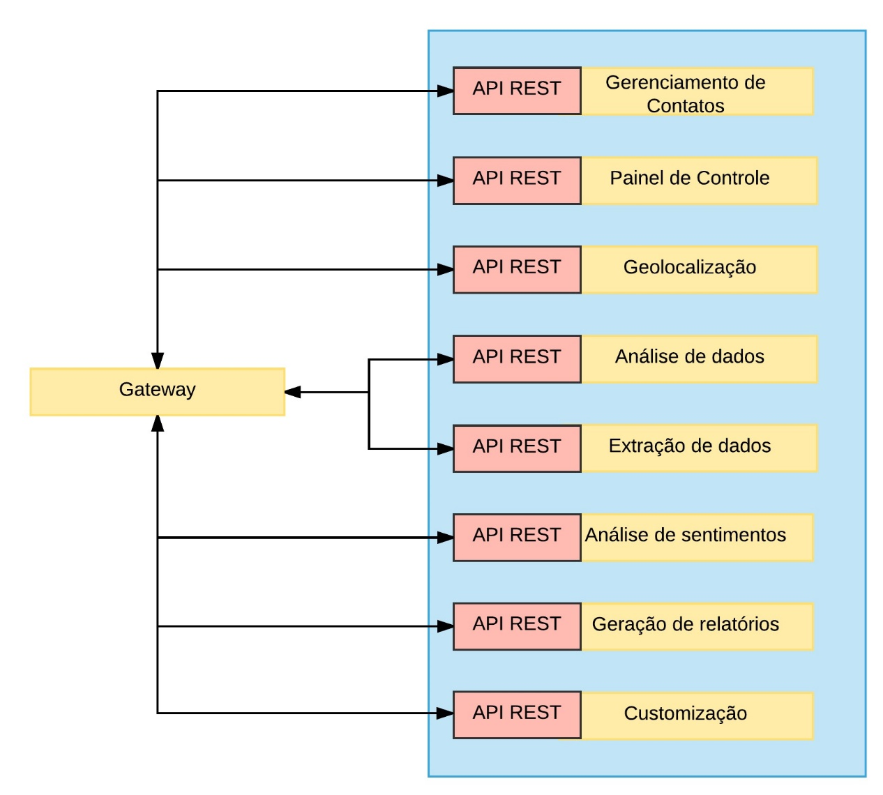 A Figura 3 representa a comunicação entre os serviços e o gateway utilizando o REST. Apesar de não estar representado na figura, a comunicação entre todos os serviços é possível, caso haja a necessidade de acessar um determinado recurso. No entanto, cada microsserviço é projetado para operar de forma independente para não gerar custos devido ao tráfego na rede.