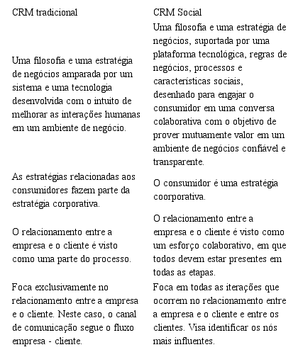Diferentemente do CRM tradicional, o CRM Social foca em todas as iterações das relações, seja entre companhias, parceiros ou clientes. Além disso, enfatiza a identificação, engajamento e habilitação dos nós que possuem maior poder de influência sobre os outros. Os consumidores sociais utilizam o ambiente colaborativo da Web para obter informações sobre suas potenciais compras e para um conhecimento mais profundo sobre seus interesses comuns (GREENBERG, 2009). O Quadro 1, realiza uma comparação dos conceitos e das funcionalidades do CRM Social e do CRM tradicional.