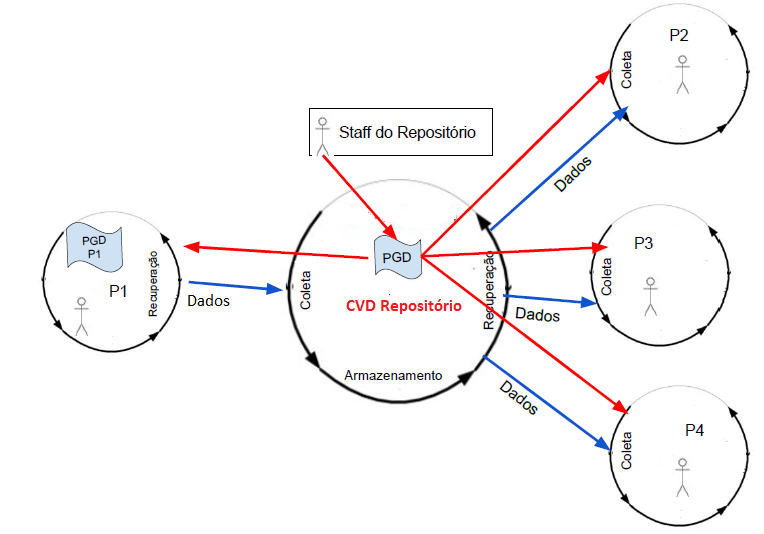 o CVD do repositório: o Staff desenvolve o PGD de acordo com as características, missão e objetivos do repositório. O PGD fica disponível para o P1 que vai depositar os dados, para os P2, P3 e P4 que farão busca e coleta de dados no repositório e para os profissionais que atuam no repositório;