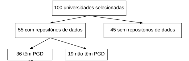 A figura 3 ilustra os caminhos que foram seguidos para a coleta nos repositórios de dados. Os resultados indicam que das 100 universidades analisadas, 55 dispõem de repositórios de dados. Desses, 36 têm PGDs, os quais foram analisados.