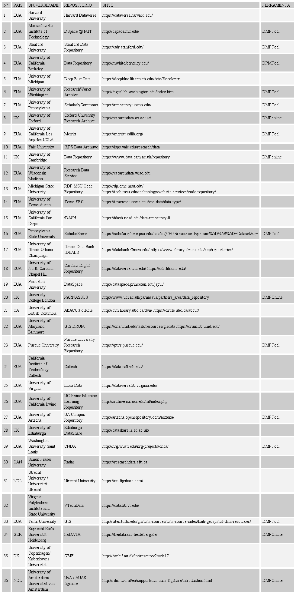 A análise incluiu a identificação dos repositórios de dados das universidades e dos seus Planos de Gerenciamento de Dados.