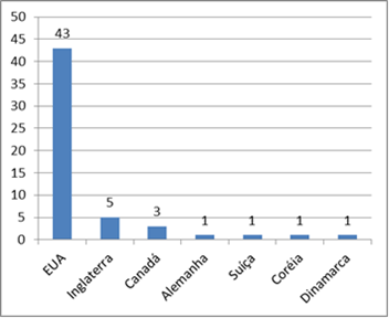 Observa-se no gráfico 1 que a maior quantidade dos repositórios de dados que foram localizados está nas universidades dos Estados Unidos no total de 43, seguido da Inglaterra com cinco e Canadá com três. Os países com menor quantidade de universidades com repositórios de dados são a Alemanha, a Suíça, a Coréia e a Dinamarca com um em cada universidade. Evidencia-se que prevalecem repositórios nas universidades de idioma inglês.