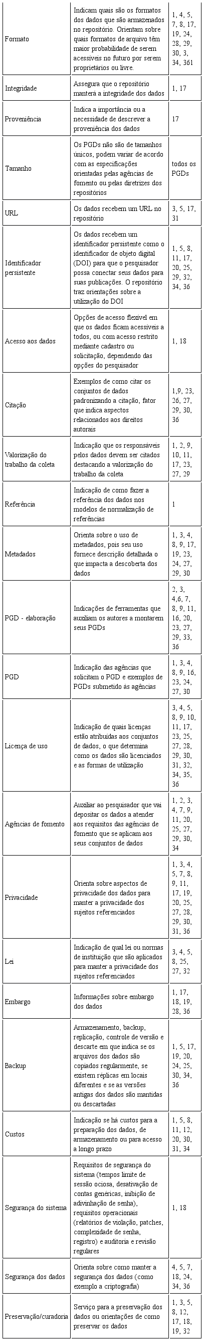 Os aspectos abordados no PGD dos repositórios variam de acordo com a comunidade alvo que atendem e aos tipos de dados que são armazenados, orientam os atores envolvidos na dinâmica dos repositórios e é primordial estarem em consonância com as orientações das agências financiadoras para a gestão de dados pelos pesquisadores. Observa-se que os PGDs não estão no mesmo nível de desenvolvimento e as informações variam entre si.