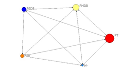A figura demonstrou que o PT foi o partido que mais recebeu menções, ou seja, é o partido com maior número de conexões junto de outro partido fora de seu website. De acordo com a Tabela 6 o PT é o mais mencionado em três websites (PMDB, PSDB e PSB).