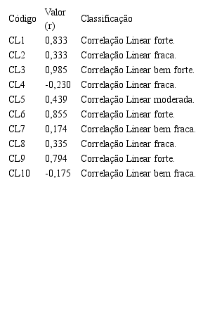 O CL1, CL6 e o CL9 obtiveram como classificação os coeficientes de 0,833, 0,855 e 0,794 respectivamente, que corresponde a uma Correlação Linear Forte. Nesses três casos todas as variáveis estão presentes, demonstrando assim a forte ligação entre as variáveis estudadas.