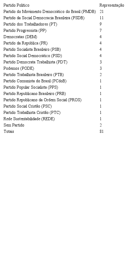 A Tabela 1 apresenta os partidos político com representação em exercício no Senado Federal selecionados.