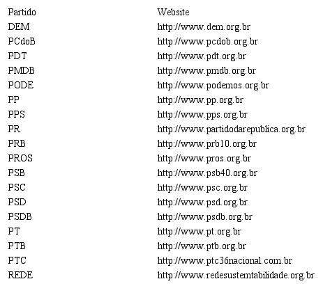 Diante dos partidos políticos apresentados sucedeu a busca pelo website que corresponde a cada partido. Os respectivos websites estão representados no Quadro 1.