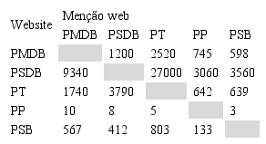 Com a finalidade de recuperar informações mais precisas acerca de conexões entre partidos políticos utilizou a técnica webométrica entre a junção do website e a menção web.