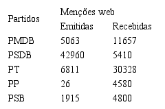 Apenas o website do PSDB emitiu mais menções web dos demais partidos que recebeu menções deles. Sendo sua emissão mais que o triplo de todas as menções emitidas dos demais websites dos partidos.
