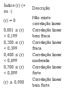 O Quadro 2 apresenta a diferenciação entre Correlação Linear bem fraca, fraca, moderada, forte e bem forte ou inexistência aplicada nesta pesquisa.