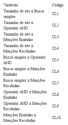 A aplicação de correlação linear teve como base cinco variáveis quantitativas, compostas pelos indicadores criados na análise de dados: Tamanho do site, Busca simples, Busca pelo operador Booleano AND, Menções Emitidas e Menções recebidas.