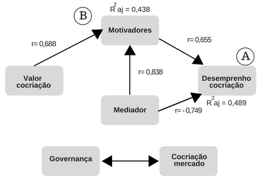 Já a variável mediadora tem uma correlação positiva de 0,838 com a variável motivadores e variância compartilhada de 0,702. E a variável motivadores uma correlação positiva de 0,655 e variância compartilhada de 0,429 com a variável desempenho da cocriação. Ou seja, a presença de um mediador incentiva e instiga os motivadores que apresentam um resultado positivo no desempenho da cocriação. Que são: estar à frente dos concorrentes em relação ao atendimento das necessidades dos clientes, lançamento de produtos adequados às necessidades dos clientes, estar à frente dos concorrentes em relação ao tempo de lançamento, e sucesso de produtos lançados. Essa parte do modelo apresenta R² ajustado de 0,489. Essa informação representa que 48,90% da variável dependente é explicada pelas variáveis independentes presentes no modelo.