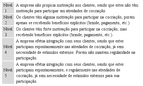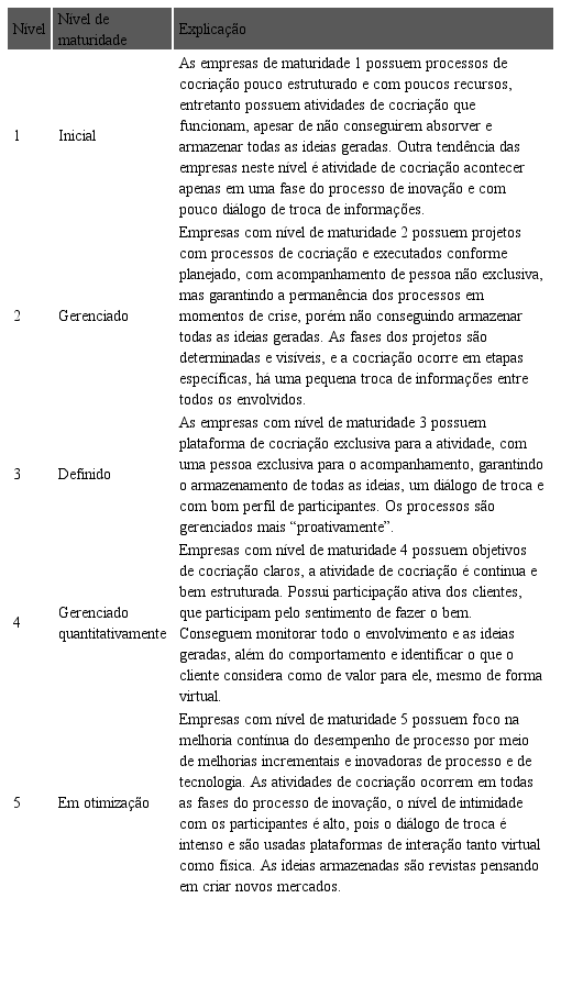 Para cada dimensão desenvolveu-se os diferentes níveis de maturidade, sendo que a maturidade final, em termos de cocriação, é calculada pela é calculada pela soma da pontuação dada dentro da escala de 1 a 5. Se o resultado dessa soma for de 70 pontos a empresa classifica-se como nível 5; se a soma for entre 69 e 56 pontos, a empresa classifica-se como nível 4; se a pontuação for entre 55 e 42 pontos, a empresa classifica-se como nível 3, pontuação entre 41 e 28, a empresa classifica-se como nível 2; se for entre 27 a 14 pontos, a empresa classifica-se como nível 1; e abaixo do nível 1 se tiver menos que 14 pontos. . A descrição dos diferentes níveis de maturidade de cada fator analisado encontra-se em anexo deste artigo.