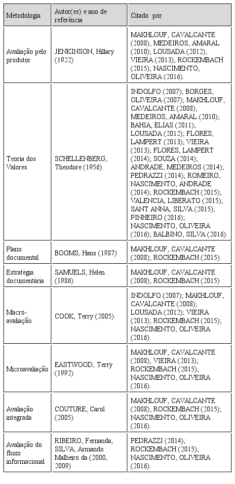 Foram identificados ainda na literatura as metodologias Plano documental (BOOMS, 1987), Estratégia Documentária (SAMUELS, 1986), Microavaliação (EASTWOOD, 1992) e Avaliação Integrada (COUTURE, 2005).