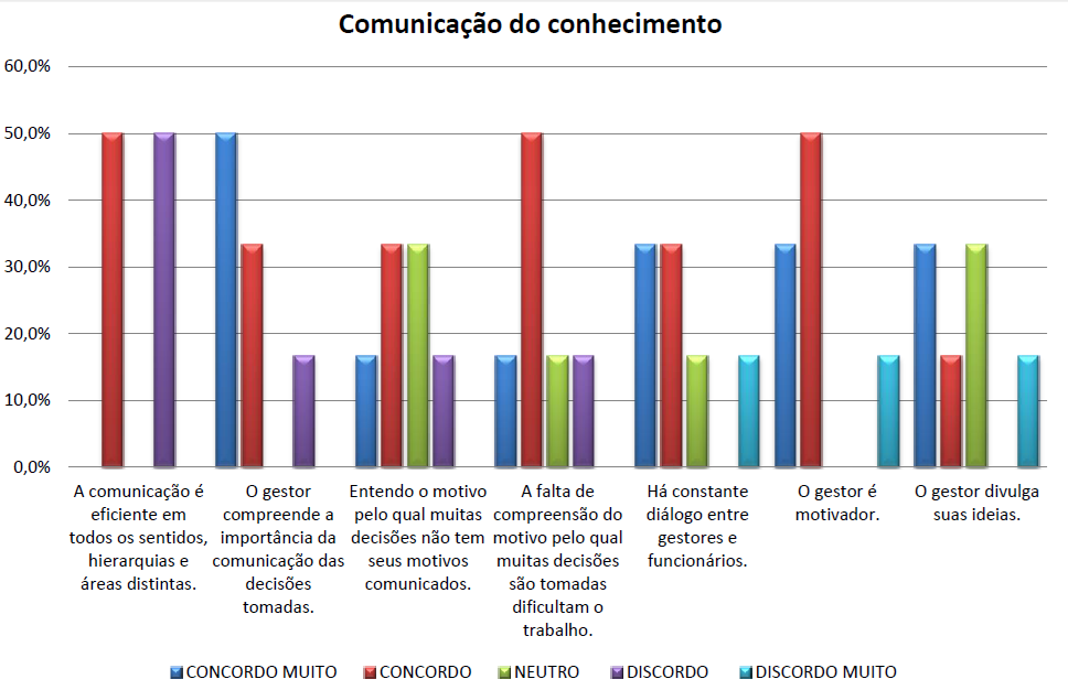 Os entrevistados são questionados se a comunicação do conhecimento atinge, de forma eficiente, os níveis hierárquicos e diferentes áreas da empresa, onde 50% concordaram e o restante (50%) discordou dessa abrangência. Ao serem perguntados se o gestor entende a importância da comunicação das decisões tomadas, 83,3% das respostas são positivas (50% concordam muito e 33,3% concordam). Quando o tema é a compreensão dos dos motivos que levam muitas decisões não serem comunicadas, 33,3% (concorda) entende e outros 33,3% se mantiveram neutro nesse ponto. Quando questionados se a falta de compreensão sobre algumas decisões tomadas dificulta o trabalho, a maioria concordou (50%) ou concorda muito (16,7%). Foi questionado sobre a existência de um frequente diálogo entre gestores e funcionários, onde 66,6% responderam de forma positiva (33,3% concordam muito e 33,3% concordam). Questionados sobre o gestor ser inovador, 50% concordou e 33,3% concordou muito. Em outro ponto, perguntado se o gestor divulga suas ideias 33,3% concordaram muito e outros 33,3% se mantiveram neutros.