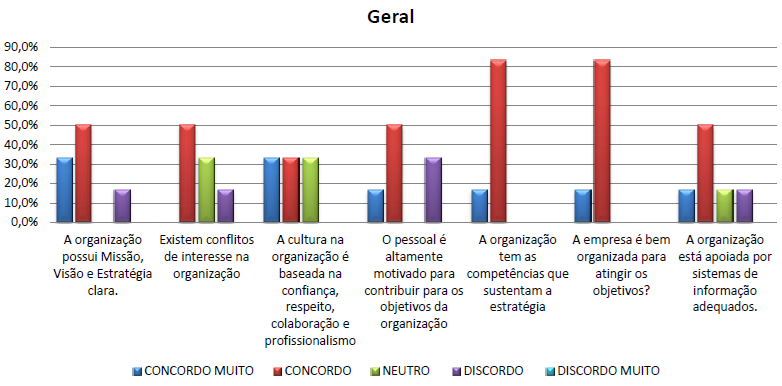 Quando se trata da demonstração de forma clara da empresa que 83,3% das respostas se mostram a favor, marcando concordo ou concordo muito, entretanto observamos que a metade dos entrevistados optou pela resposta concordo (50%). Quando questionados sobre conflitos de interesse dentro da organização 50% dos entrevistados concordou com a existência desse fato, outros 2 entrevistados (33,3%) permaneceram neutros ao assunto. Quando questionados sobre a base da cultural da organização ser composta por confiança, respeito, colaboração e profissionalismo, obtiveram-se 33,3% de respostas em concordo muito, concordo e neutro, o que demonstra que 66,7% das empresas acredita que a base da empresa deve ter esses quatro pilares. Quando se fala sobre motivação de pessoal para contribuição com os objetivos da empresa obtivemos metade das respostas (3), entretanto, 33,3% das respostas (2) discordaram desse ponto.