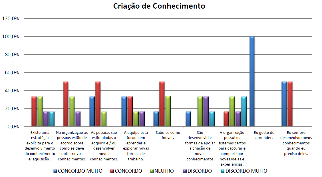 O questionário inicia com a pergunta relacionada a existência de uma estratégia clara de desenvolvimento e aquisição de conhecimento onde as repostas concordo e neutro ficaram cada uma com 33,3% das respostas, discordo e discordo muito ficaram com os outros 33,3% (16,7% cada). A pergunta relaciona a concordância das pessoas ao modo como se deve obter novos conhecimentos na organização representou nas respostas com 50% concordam, o restante das respostas se divide entre neutro (33,3%) e discordo (16,7%). Obtemos 83,3%, concordo muito (33,3%) e concordo (50%), de respostas quando o questionamento se referiu a existência de estímulos para adquirir ou desenvolver conhecimentos novos.