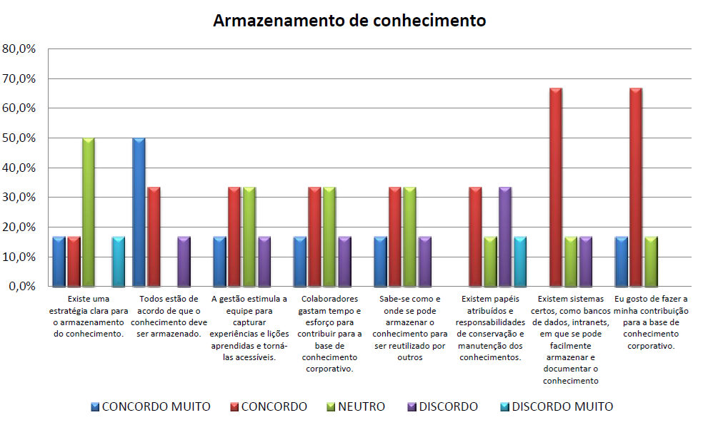 A primeira pergunta se referia a clareza nas estratégias da empresa em armazenar o conhecimento onde a maioria das respostas foi neutro (50%), seguido por concordo muito, concordo e discordo, todas elas com 16,7%. Perguntados se todos concordam que o conhecimento deve ser armazenado, 50% concordam muito com esse fato e 33,3% assinalaram que concordam (83,3% de respostas positivas).