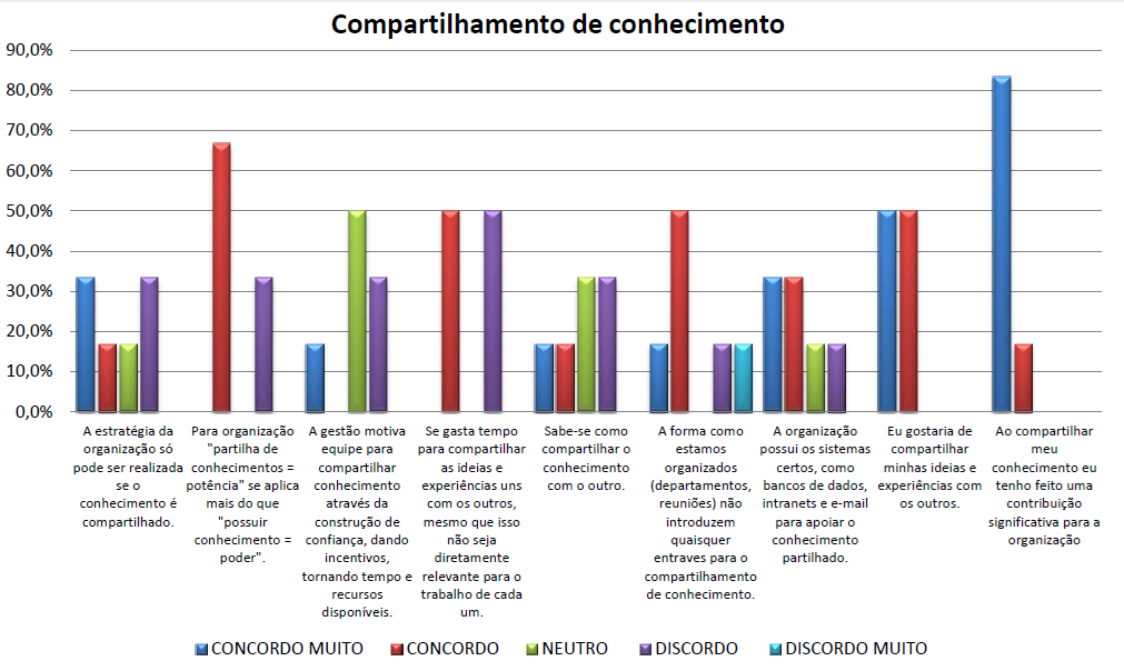 Sobre a motivação para que a equipe compartilhe seu conhecimento 50% se manteve neutro. A existência de tempo gasto para compartilhamento de ideias e experiências (mesmo essas não estando ligadas diretamente ao trabalho) existiu divergência, onde 50% concordaram e os outros 50% discordaram com a existência. Referende a equipe saber como compartilhar o conhecimento entre si 33,3% se manteve neutros e outros 33,3% discordaram. Foi questionado também sobre a possibilidade de o modo da empresa estar organizada não atrapalharem o compartilhamento do conhecimento, o que foi afirmado pela maioria dos entrevistados onde 50% concordaram e 16,7% concordaram muito. 66,6% (33,3 concordando muito e 33,3% concordando) afirmaram que possuem sistemas para apoiar o armazenamento de conhecimento. Quando questionados sobre a vontade de compartilhar as experiências com os outros obteve-se 100% de afirmação, onde 50% marcaram concordo muito e os outros 50% concordo. Em seguida foi questionado se o compartilhamento do conhecimento dos entrevistados tem contribuído positivamente para a empresa, 83,3 concordaram muito com a existência dessa contribuição e o restante (16,7%) se manteve no concordo.