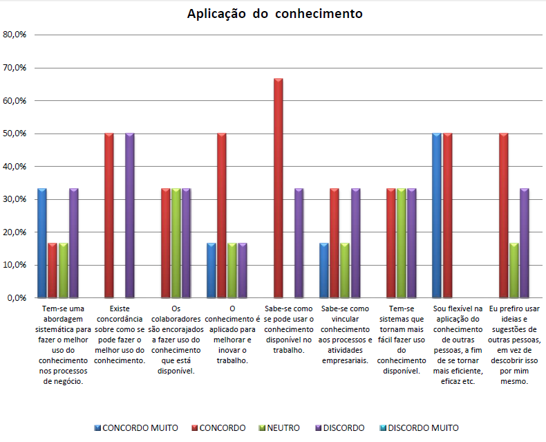 Inicia-se com a questão sobre a existência de uma abordagem sistemática para o melhor uso do conhecimento nos negócios da empresa, onde 33,3% concordam muito e outros 33,3% discordam dessa existência. Quanto tratou-se sobre a existência de uma concordância no melhor modo de usar o conhecimento tem-se uma discordância, onde 50% concordam e 50% discordam. Os entrevistados foram questionados também se existe um encorajamento aos colaboradores utilizarem o conhecimento disponível na empresa, onde 33,3% concordaram e 33,3% discordaram da existência, os outros entrevistados se mantiveram neutros nessa questão. Questionados se esse conhecimento é aplicado para melhor e inovar o trabalho 50% respondeu que concorda com essa aplicabilidade. Perguntou-se então se compreende como usar esse conhecimento disponível na organização, as respostas foram em sua maioria positiva (concordo 66,7% contra discordo 33,3%).