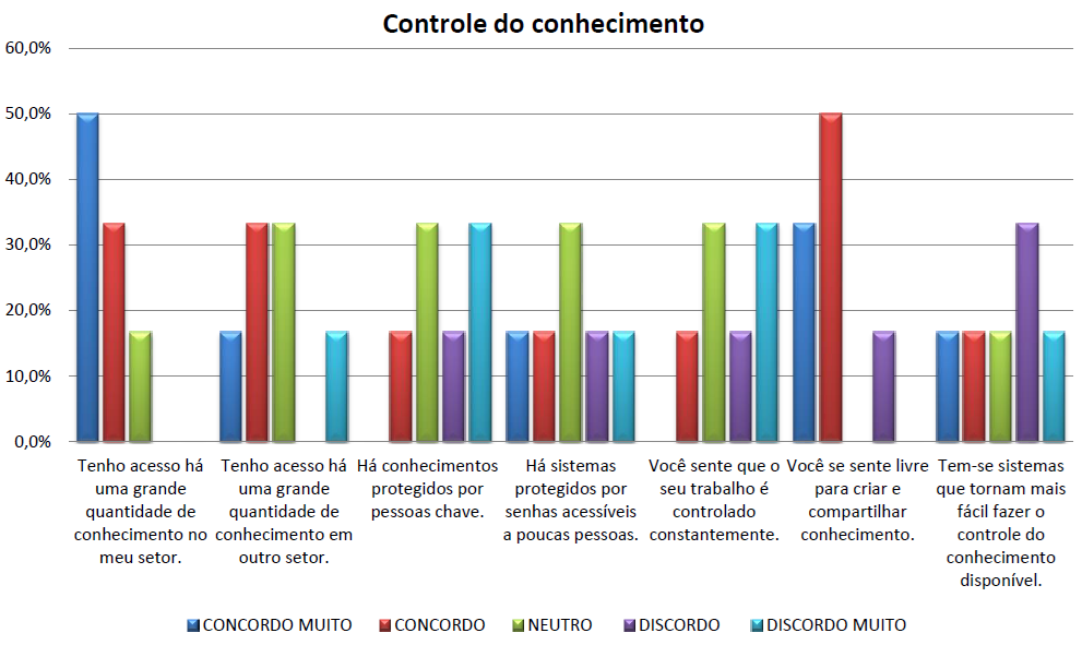 De início é indagado se o entrevistado tem acesso a uma grande quantidade de conhecimento do seu setor de atuação, onde 50% concordam. Quando a mesma pergunta é realizada, mas se referindo a conhecimento de outros setores 33,3% concordam, enquanto 33,3% permanecem neutros. Há existência de conhecimento protegido dentro das empresas consultadas foi respondido com 33,3% de mantando neutro e outros 33,3% discordando muito. Obteve-se respostas bem diferentes quanto o tema foi a existência de sistemas protegidos, utilizados por poucos indivíduos da organização, onde 33,3% se mantiveram neutros, e concordaram muito, concordaram, discordaram e discordaram muito 16,7% em cada. Sobre a sensação do trabalho ser controlado constantemente, os entrevistados, 33,3% responderam que discordam muito enquanto outros 33,3% se mantiveram neutros. Sobre a sensação de liberdade para criar e compartilhar conhecimento as respostas foram positivas, 50% concorda e 33,3% concorda muito com esse fato. Questionados sobre a existência de um sistema que facilite o controle do conhecimento disponível as respostas voltaram a ser espaçadas, 33,3% discordam e o restante se divide em concordo muito, concordo, neutro e discordo muito (16,7% cada)